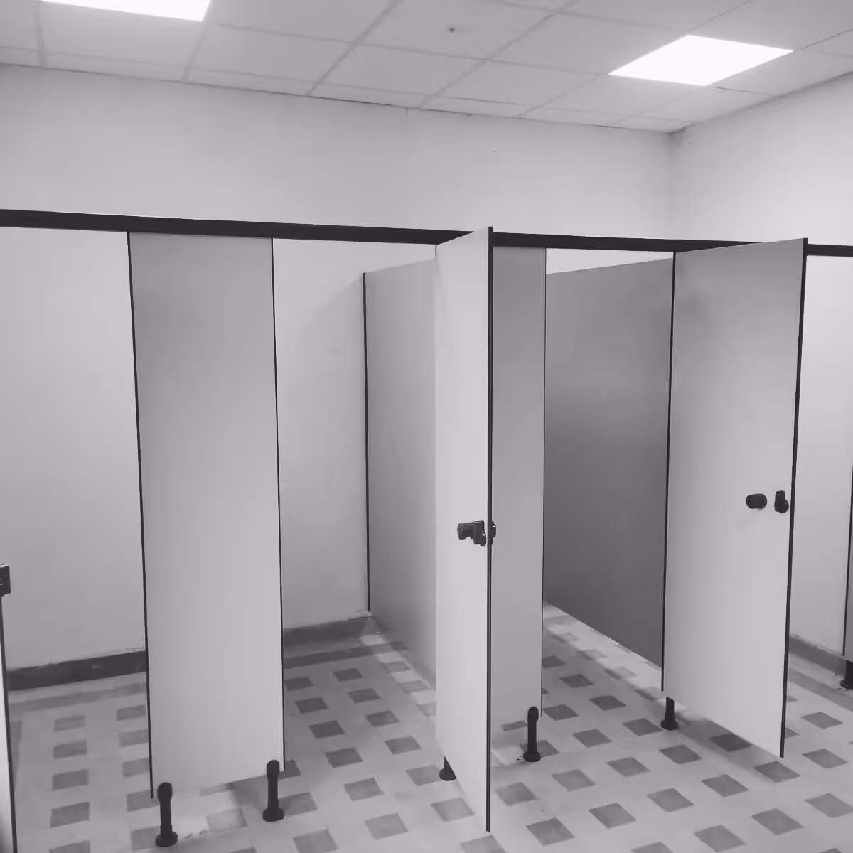 Het plaatsen van systeemplafonds en sanitaire tussenwanden in kunststof.